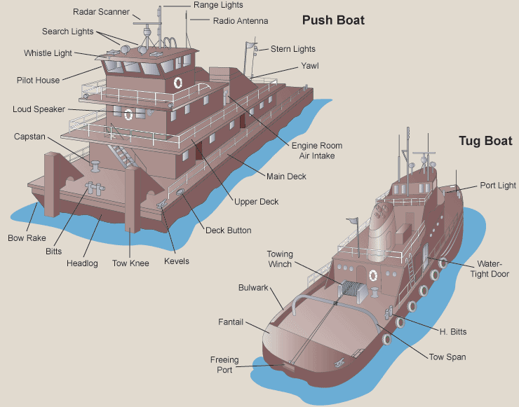 *A common misunderstanding is made between towboats and tugboats. Tugboats usually have deeper hulls, making them more seaworthy. They are used generally to help larger vessels maneuver in port. Towboats, or push boats, have flat bottoms and are used to push barges and cargo on Inland Waterways.