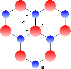 The red circles (defined as A) represent Arsenic (As) atoms, and the blue circles (defined as B) represent Gallium (Ga) atoms, thus forming the graphite (GaAs) lattice structure. When A sites are occupied by cylinders, a triangular structure is formed. When B sites are occupied by cylinders of the same type, a graphite structure is obtained. Essentially, the structure is stretched along an axis into the page to create cylinders, as shown in Fig. 2 below.