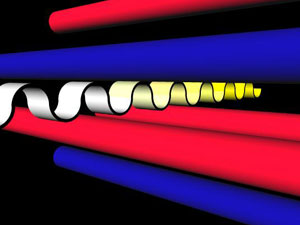 Fig. 3 Below is an example of a one-dimensional photonic crystal. The process is similar to Fig. 4: Bright light enters perpendicular to the cylinders from the front. The contrast between the two dielectric materials (red and blue cylinders) offsets the blue wavelengths of white light slightly out of phase, similar to Fig. 4. The constructive interference of the two blue light waves creates a region of forbidden wavelengths, called a bandgap. This allows green and red light through to create yellow light, which is less intense to the human eye, as shown below.