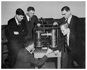 Stanford researchers in 1939 examine their invention, a klystron. Left to right are Sigurd Varian, physicists David Webster and William Hansen, and in the front are Russell Varian, left, also a physicist, and John Woodyard, an engineering graduate student.