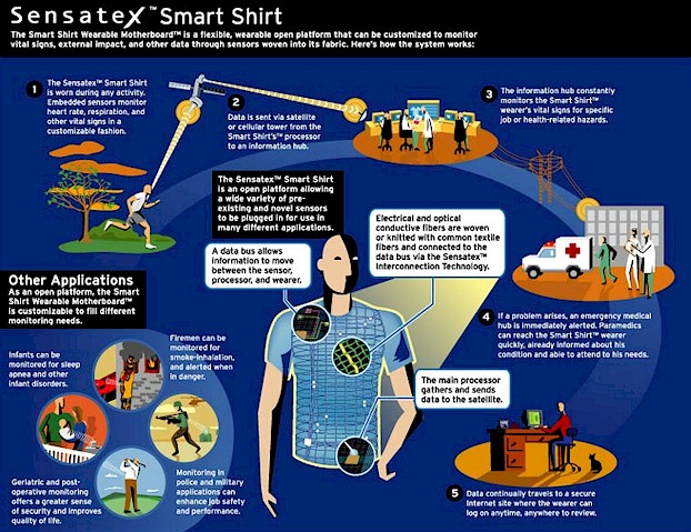 Sensatex, Inc. is a life science technology company focused on Smart Textile Systems. The Sensatex SmartShirt is Sensatex's first patented project and is currently under field trials as of May 1, 2007. This shirt�s main purpose is to monitor a person's physiological information and movements (heart rate, respiration, and other vital signs). The data is sent via satellite so that an information center can monitor the wearer. Needed emergency services can be contacted to reach the SmartShirt wearer quickly. The wireless technology used for the "Smart Shirt" system using Bluetooth and WLAN. This technology in not as reliable but has great promise for monitoring.