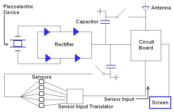 To eliminate the problem of the current traveling directly through the capacitor because we are receiving a frequency, there needs to be volt sensing switches on either sides of the capacitor. These switches are respectively the same as the capacitors in response to discharging at the correct times, and close the circuit to keep the capacitor charged and stops it discharging prematurely. Once the correct charge is released, the capacitor sends the current to the switch, which closes to complete the circuit to the device(s). The advantage of using volt sensing switches is that power is not always required, and allows us to use power in bursts. The power not consumed by the capacitors travels to the circuit board, which takes messages received from the Helikite and transmits them to the screen, which is receiving its power through the circuit board. The circuit board also contains a small rechargeable device that keeps the power to the screen on, and has the ability to draw from the charge on the capacitors in the event the first responder stops creating a force on the shoes.