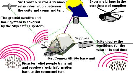 Our product is a multi-faceted system of communication. Our goal is to achieve a higher level of interoperability between disaster victims, first responders, and central command during both large and small scale disasters. This system consists of a "Smart Suit" equipped with internal/biological and external sensors, as well as a GPS. Internal sensors will detect respiration, blood pressure, heart rate, posture, and skin temperatures; external sensors will monitor climate, concentrations of gases, and radiation. These sensors are wired to a data translation device, which is then connected to the motherboard of a 3G-cell phone device located on the shoulder of the suit. Another critical function of the 3G-cell phone device is its receiver/transmitter that will send and receive voice, data, and video information to a WiMAX antenna suspended from a Helikite that is tethered to the mobile base. Information will be sent from the antenna to the base unit via an optical fiber cable. This physical, hard connection will provide additional reliabilty to the system. Information regarding the disaster can then be shared amongst all levels of command, all the way up to national/international command centers, using satellite technology.