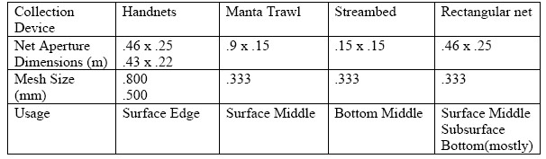 They have developed a small device, called a manta trawl, that they carry on the back of a boat which skims across the top of the water while traveling through the ocean. This device is just for samples to test the different kinds of plastics in the ocean so they can later find out an efficient way to effectively get every last bit of the debris out of the ocean. Right now they are only in the very beginning of their research stage. A second method of collection is called a Bongo Net, having a mesh of 333 microns, which vertically samples waters from a depth of up to 100 meters. In every sample that they have procured they have found plastic debris.