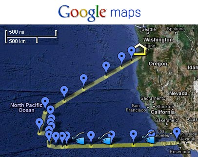 Partnering with Project Kaisei, the Scripps research vessel the New Horizon joined with Project Kaisei's iconic tall ship the Kaisei on an expedition to the North Pacific gyre from August 2-21 of 2009. Their purpose was to find out: how much plastic is accumulating, how is it distributed, and how is it affecting ocean life. On the right is a map of their route.