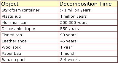 Plastic Decomposition is the ability of plastic to separate or resolve into constituent parts or elements over time. It is unfortunate that plastics take such a long time to decompose, if they do at all. The table below shows the average time for certain plastics to decompose compared with other degradable objects.