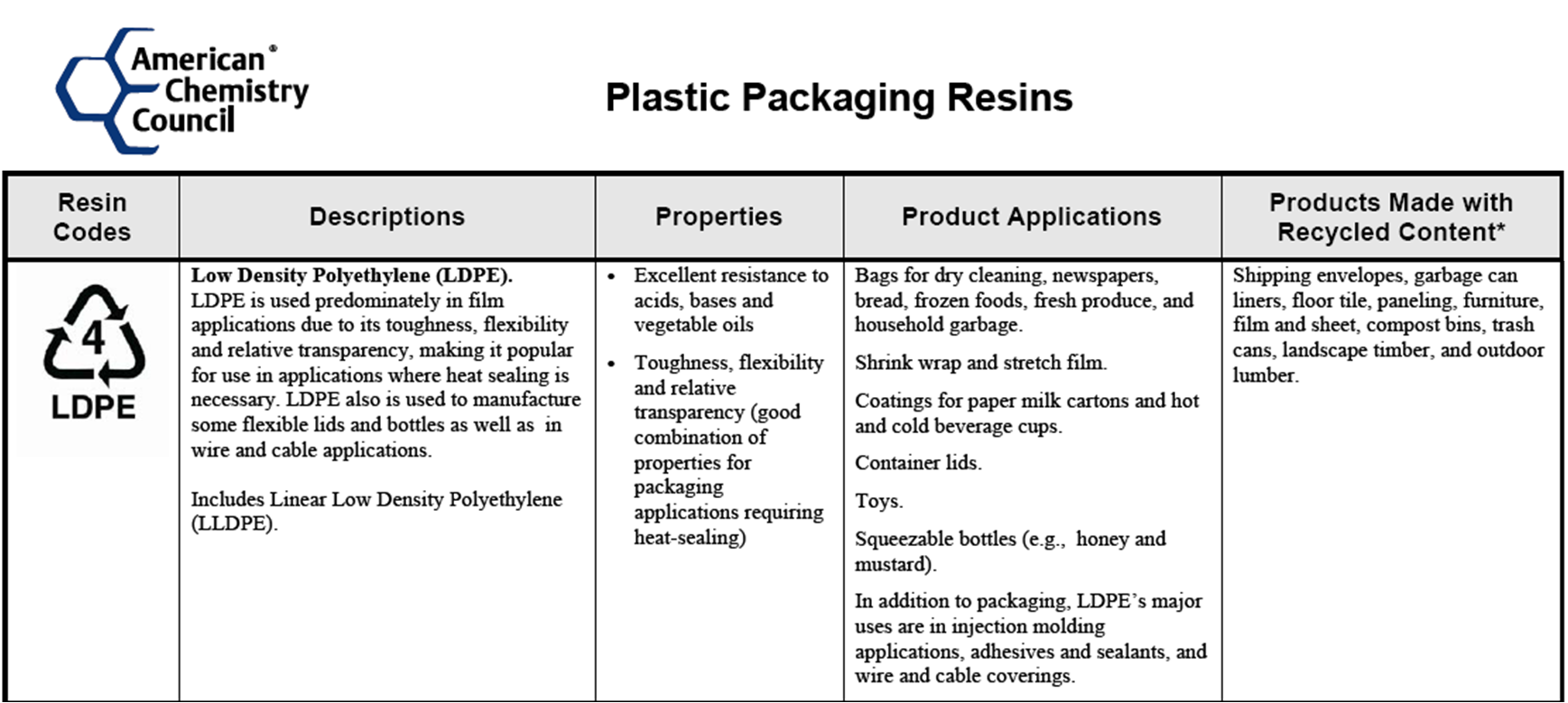 Low density polyethelyn ( LDPE) is generally used for things such as shrink wrap/stretch wrap and is even used for the plastic coating on paper milk cartons or juice boxes. |