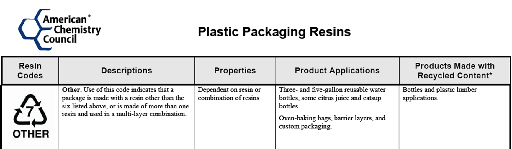 The "other" category consists of packages or other things that are made with a plastic resin other than the previously stated plastics, or has multiple types of plastic resins in it. |