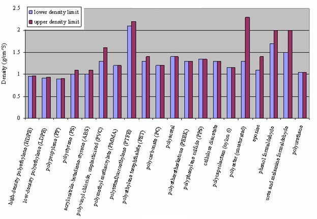 As shown below, most plastics have a density hovering between 0.8-1.5 g/cm3. This image is courtesy of Evan I.