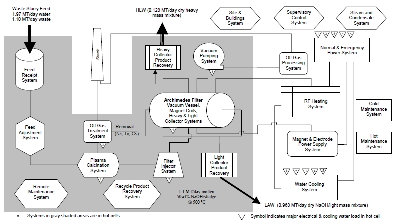 The Process begins with all the waste being injected into the waste feed system as homogeneous slurry and small batches are periodically pumped into the feed adjustment system. In the feed adjustment system sodium hydroxide is added to the slurry until it is 50% NaOH by weight. Carbonates are removed in this step as well. The adjusted slurry is pumped into the plasma calcination system. This system rapidly heats the slurry to a temperature of 500 degrees Celsius through the use of a plasma torch. This allows all of the aqueous materials to be burned off. The water vapor and other gases are processed to remove radioactive materials and the excess non-radioactive gases are released through a stack. The slurry that was pumped into the plasma calcination system is now a caustic melt and is pumped through the filter injector system. The filter injector system uses an inductively coupled plasma (ICP) torch to vaporize the caustic melt to temperatures of approximately 5000 �C. At this point the vaporized waste is injected into the Archimedes Plasma Mass Filter. The Archimedes Plasma Mass Filter releases the light ions as a caustic melt mixture and is sent to the Light Collector Product Recovery System. At this stage the light ions are processed in accordance with the Low Activity Waste (LAW) requirements. The heavy ions are collected as aqueous slurry and are stored until it can be sent to a High Level Waste preprocessing facility. The rest of the AFP system supports the operation of the plant by supplying electricity, heating, and cooling elements.