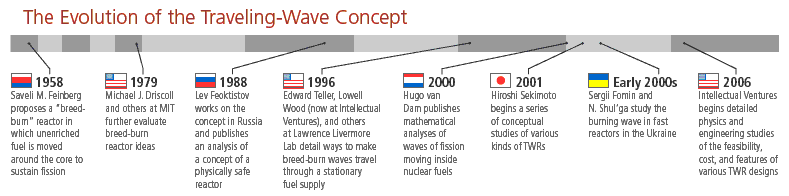 The idea was not picked up again until the late 1970�s and still only on a theoretical level. Not until the late 1990�s did the reactor concept begin to get some serious interest when Lawrence Livermore Labs found a method in which breed-burner waves could travel through a fuel supply. In 2006 Intellectual Ventures, a company backed by Bill Gates, started developing detailed ideas on engineering specs, costs and feasibility in the creation of Traveling Wave Reactor.