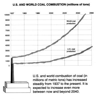 Coal is one of the most useful fuel sources mankind has ever discovered. Coal currently generates 27% of the world's primary energy and 41% of its electricity. While coal is used worldwide it is not found worldwide, only in a few select locations. The countries on top of these locations produce enough coal to export to countries without coal. Coal is in high demand so countries mine billions of tons of coal a year; the top four countries in 2008 were China who produced 2848 billion, The U.S. with 1172 billion, India with 568 billion, and the former USSR with roughly 563 billion. When burning coal inside coal-fired power plants 40% of the thermal energy can be changed into electricity. For every ton of coal 2460 kWh can be made. It is predicted that coal use will increase 50% by 2030 due to third world countries meeting electrical rates.Oil