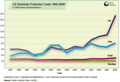 The use of nuclear power provides answers for many problems in the areas of the environment, safety, economics, reliability, sustainability, and even waste. Like fossil fuels, the nuclear fuel raw materials come from the Earth. Uranium, the primary fuel material, is mined. The environmental impact of mining is well known; however, the advantage of nuclear power comes from the amount of power that comes from a small amount of uranium. The power from one kilogram of uranium is approximately equivalent to 100,000 kilograms of oil; therefore, as a function of power consumption, very little uranium needs to be removed from the ground; hence, the environmental impact of uranium mines is much less compared with mining and drilling for fossil fuels.Nuclear power plants are one of the most economical forms of energy production. Nuclear fuel costs (as a function of power generation potential) represent only a fraction of the cost of fossil fuels. Including capital and non-fuel operating costs, the cost of operating a nuclear power plant is roughly equivalent to fossil fuels. Recently, the average electricity production cost for nuclear energy was recognized as the cheapest source of electricity. In 1999, the average cost of power generation by nuclear plants was 1.83 cents per kilowatt-hour, for coal-fired plants 2.07 cents, for oil 3.24 cents, and for gas 3.52 cents. Costs for solar and wind are still well beyond that considered to be competitive to the public.