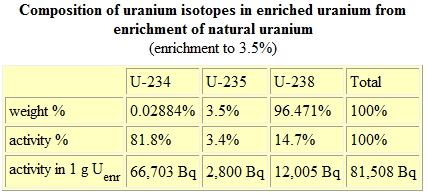 The two primary methods of enriching uranium hexafluoride use gaseous diffusion or a gas centrifuge. Both methods require expensive capital outlays for equipment, but the power required to operate the gas centrifuges is less expensive. Once the uranium-238 is enriched to 3-4% uranium-235, the activity rate for the enriched uranium fuel (UF6) originally processed from yellowcake is shown below.