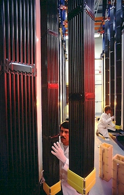 Once placed inside a reactor, the fuel assemblies are rotated three times, at 18-month intervals. When their fuel is exhausted, the asemblies are removed from the reactor and moved to a cooling pond where they spend up to 5 years. During this time they can emit radiation at a rate of up to 5% of their original heat levels. After being removed from the cooling pond, they are sealed in steel or reinforced concrete dry casks for long term storage. Notice in the chart provided below that the activity rate for the spent nuclear fuel (SNF) has numerous additional padioactive pollutants from its time in the reactor.