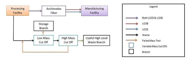 Once at the AFP facility an overhead crane, with the assistance of servo manipulators, loads the uranium into the designated input port. The Archimedes filter is tuned to have a mass cut-off between 235U and 238U. Once the Archimedes Filter System has separated the enriched uranium-235 from the depleted uranium-238 the two are removed from the Archimedes Filter through a vacuum system and pumped to the Manufacturing Facility.