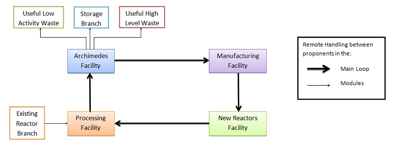 I see it as the final piece of to the nuclear cycle: nuclear generation by large reactor, waste disposal, recycling of separated waste products, and regeneration of power using the by-products of nuclear waste. The concept is adding this last piece on-site to share facilities and equipment. The product is an on-site manufacturing facility that processes and converts nuclear waste (Archimedes), turns it into useable fuel, completes construction of fast reactors, and installs them on-site or ships them out to end user customers.