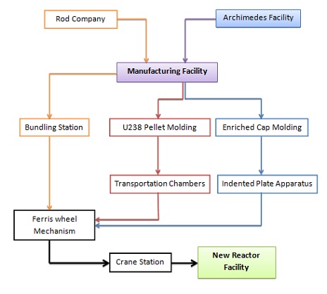 To commence stage 3, the Manufacturing Facility would receive depleted 238U along with an independent stream of 235U in a caustic melt fromm the Archimedes facility. These materials would travel between facilities via vacuum pumps. The two elements will be carried to separate locations to undergo preparation to become fuel rods; one station where pellets will be formed and distributed to hollow rods and the other, where the TWR starter caps will be produced.