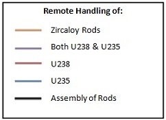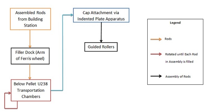 The zircaloy rods represent containers with flat sealed bottoms and open tops. They are preassembled into their bundles before being brought to collect the pellets from the grinding discharge station. The first degree of rotation of a mechanism grabs the bundles of empty rods and positions it underneath the discharging chambers with the open top face-up in a similar fashion to a Ferris wheel. As one rod is filled the mechanism�s second degree of rotation horizontally rotates the bundle so that the empty rods are sequentially filled to their maximum capacity. Once each of the rods in the bundle has been filled, the first degree of rotation of the mechanism brings the bundle to an angle where the cap is attached.