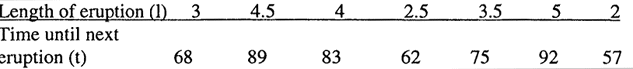 The length of time between eruptions of Old Faithful, a geyser in Yellowstone Park, can be predicted with a linear equation. The table gives some data values (in minutes) for the geyser's eruptions.
